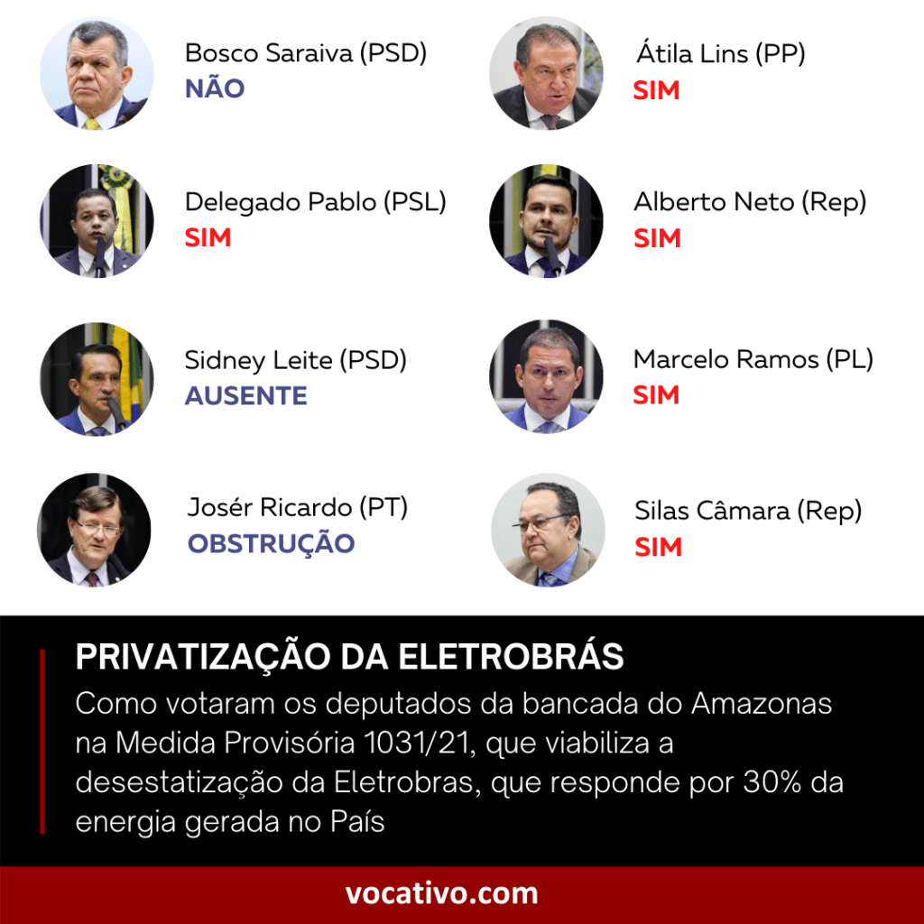 A Câmara dos Deputados aprovou nesta segunda-feira (21), por 258 votos a 136, o texto-base da medida provisória que viabiliza a privatização da Eletrobras. A proposta prevê, entre outras medidas, a emissão de novas ações da Eletrobras, a serem vendidas no mercado sem a participação da empresa, resultando na perda do controle acionário de voto mantido atualmente pela União. A matéria segue para sanção presidencial. Veja como cada deputado do Amazonas votou na proposta: