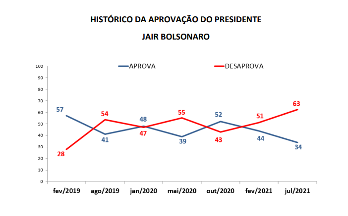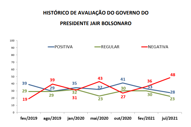A pesquisa mostrou piora da avaliação positiva (ótimo + bom) do governo federal em relação ao levantamento realizado em fevereiro de 2021, assim como aumento da sua avaliação negativa (ruim + péssimo), que chegou a 48,2%. Em relação à aprovação pessoal do presidente Jair Bolsonaro, também se observa piora na comparação com a última pesquisa, com desaprovação de 62,5%.