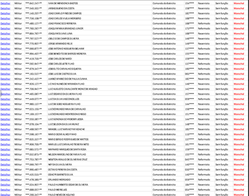 Segundo reportagem da revista Fórum, dados públicos disponibilizados no Portal da Transparência informam que 100 generais de exército (último posto da escala hierárquica do Exército Brasileiro) receberam a patente de marechal, extinta desde 1967. E o pior: Carlos Alberto Brilhante Ustra, coronel do Exército condenado em 2008 pela Justiça brasileira como torturador durante a Ditadura Militar (1964-1985) é um deles.