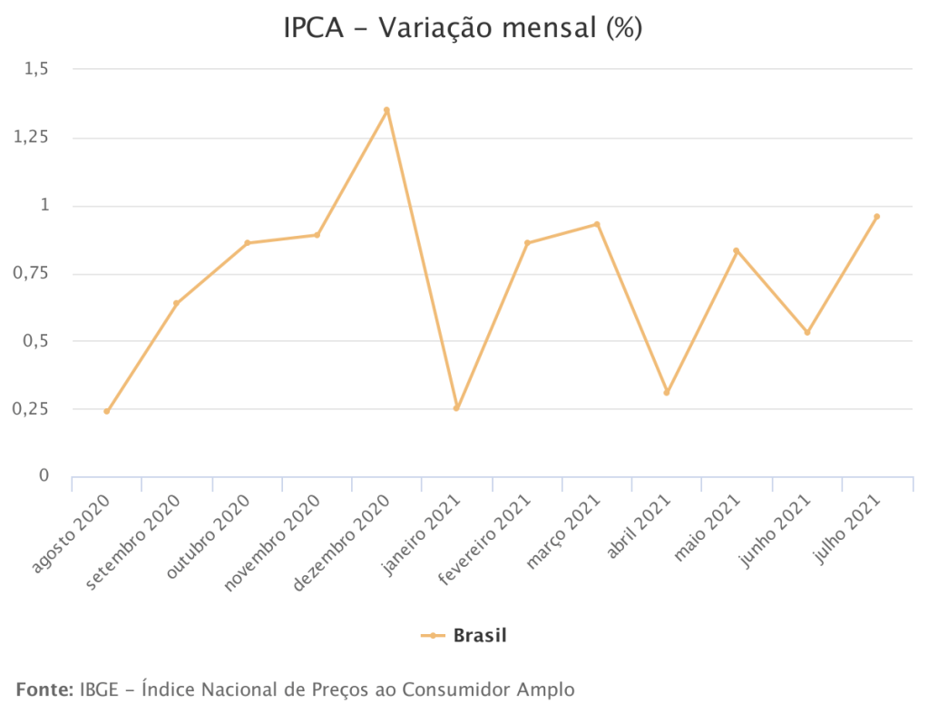 A inflação acelerou para 0,96% em julho com reajustes dos preços da energia elétrica, registrando o maior resultado para o mês desde 2002 (1,19%). Com isso, o indicador acumula alta de 4,76% no ano e de 8,99% nos últimos 12 meses, acima do acumulado nos 12 meses imediatamente anteriores (8,35%). Em julho de 2020, a taxa mensal foi de 0,36%. Os dados são do Índice Nacional de Preços ao Consumidor Amplo (IPCA), divulgado hoje (10) pelo IBGE.