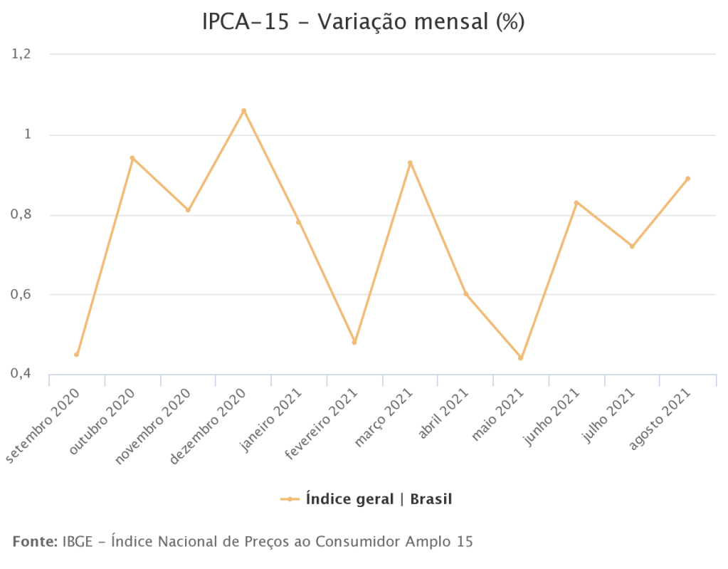 Puxado pelo aumento da energia elétrica, o Índice Nacional de Preços ao Consumidor Amplo 15 (IPCA-15) ficou em 0,89% em agosto. Esse resultado é o maior para um mês de agosto desde 2002, quando atingiu 1,00%. No ano, o indicador acumula alta de 5,81% e nos últimos 12 meses, de 9,30%, apontam os dados divulgados nesta quarta-feira (25/08/21) pelo IBGE.