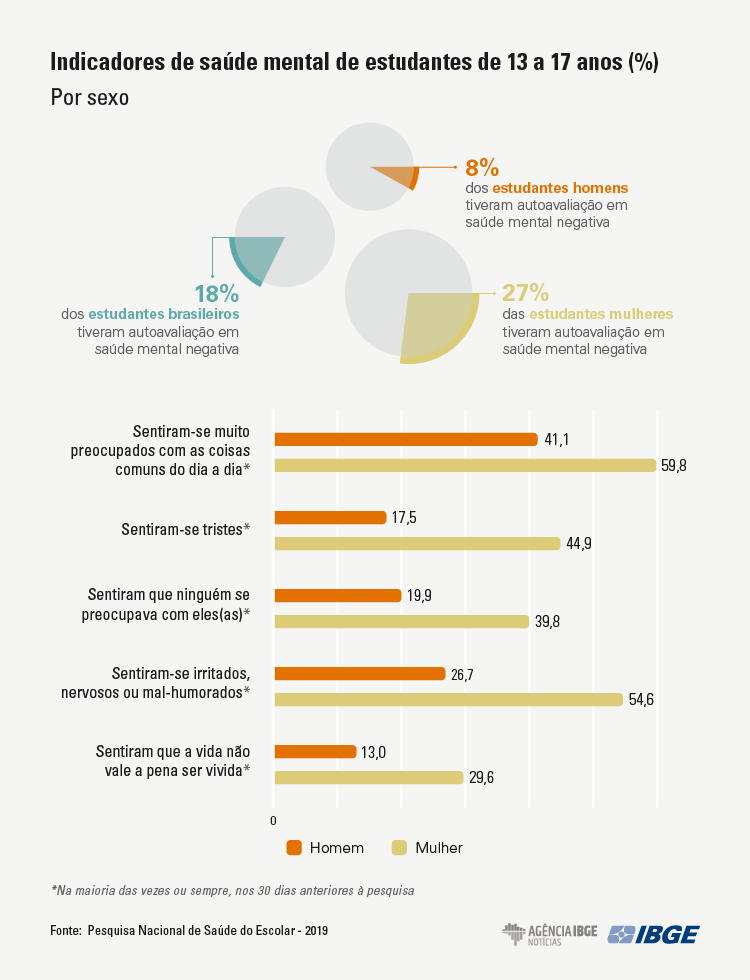 Elas têm se sentido mais tristes, a maior parte do tempo, do que os meninos. E também mais preocupadas, ou sentindo que ninguém se preocupa com elas, ou ainda que a vida não vale a pena ser vivida. As informações da Pesquisa Nacional de Saúde do Escolar (PeNSE), divulgada nesta sexta-feira (10/09/21) pelo IBGE, retratam um cenário preocupante quanto à saúde mental dos 11,8 milhões de estudantes de 13 a 17 anos entrevistados em 2019. Especialmente, no que se refere às meninas, que representaram 50,7% desse total.