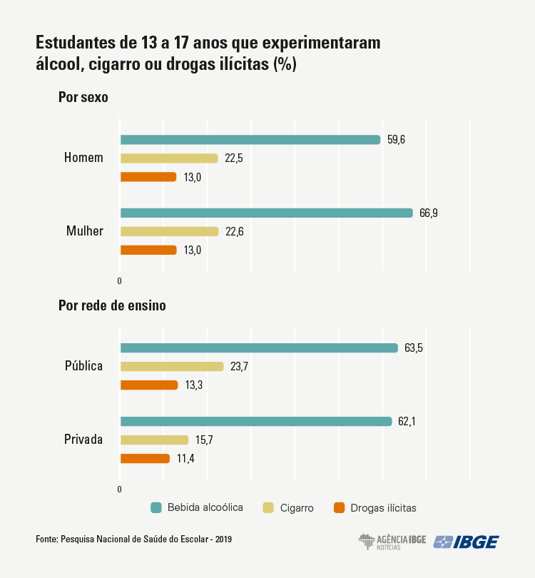 Cerca de 63,3% dos estudantes de escolas públicas e particulares entre 13 e 17 anos já experimentaram bebida alcoólica e mais de um terço deles (34,6%) provou pelo menos uma dose antes de completar 14 anos. As meninas são mais expostas a essa iniciação precoce: 36,8%, contra 32,3% entre os meninos. Os dados são da Pesquisa Nacional de Saúde do Escolar (PeNSE) 2019, divulgada nesta sexta-feira (10/09/21) pelo IBGE.