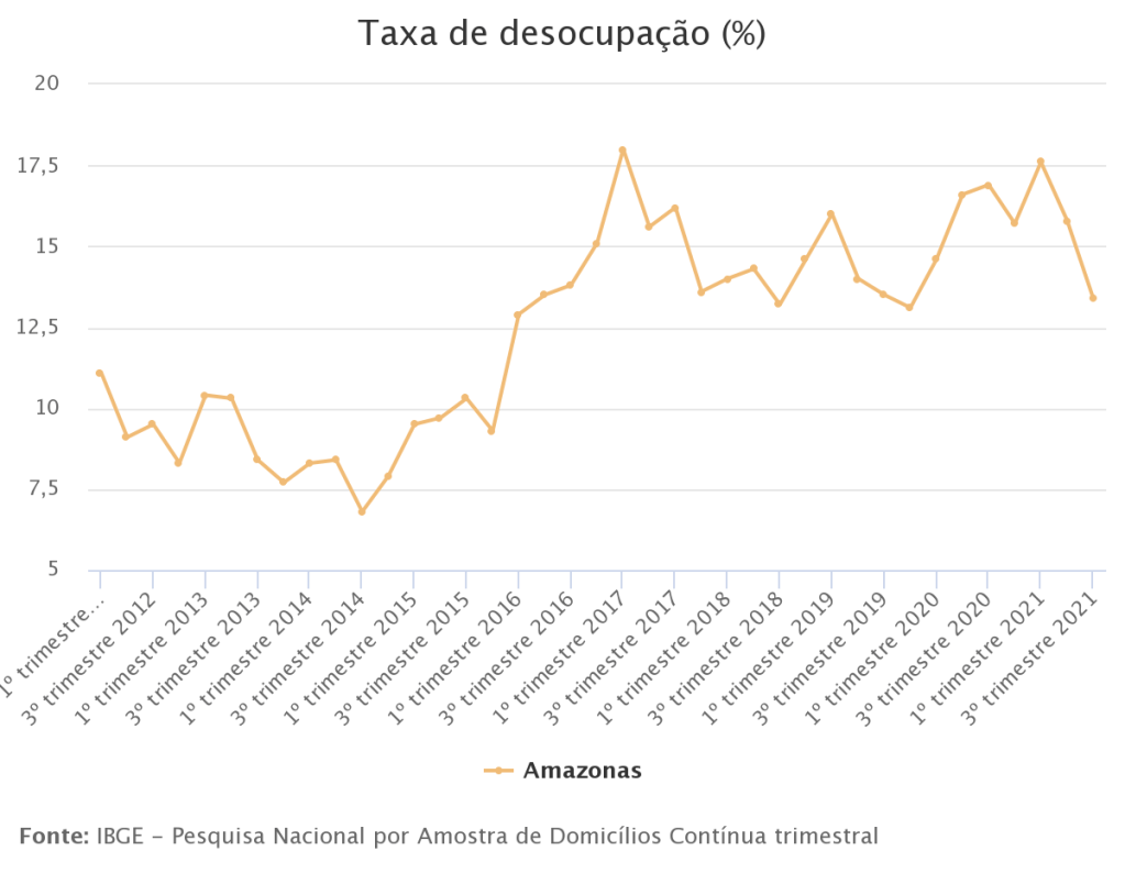 Enquanto no resto do país o número de pessoas desocupadas é de 12,6%, no Amazonas o número chega a 13,4%, só perdendo para o Pará. A taxa de desemprego no Estado caiu 2,3 pontos percentuais no terceiro trimestre de 2021, na comparação com o trimestre anterior (foi de 15,8% para 13,4%). No entanto, a taxa de informalidade alcançou 59,5% das pessoas ocupadas no 3º trimestre do ano, a segunda maior taxa do país. Com isso, o Amazonas apresenta a 13ª maior taxa de desocupação do país.