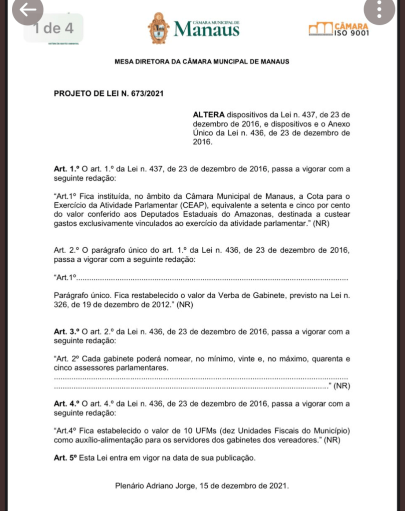 Vereadores da Câmara Municipal de Manaus (CMM) aprovaram nesta quarta-feira (15/12/22) o Projeto de Lei 673/2021, que dobra o valor da Cota para exercício da Atividade Parlamentar, conhecido popularmente como Cotão. Outra mudança estabelecida foi o direito de alocar até 45 assessores parlamentares, 10 a mais do que atualmente é permitido. A manobra aconteceu no último dia de sessão plenária de 2021.