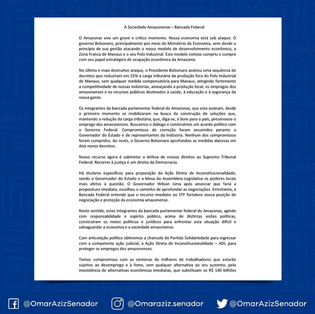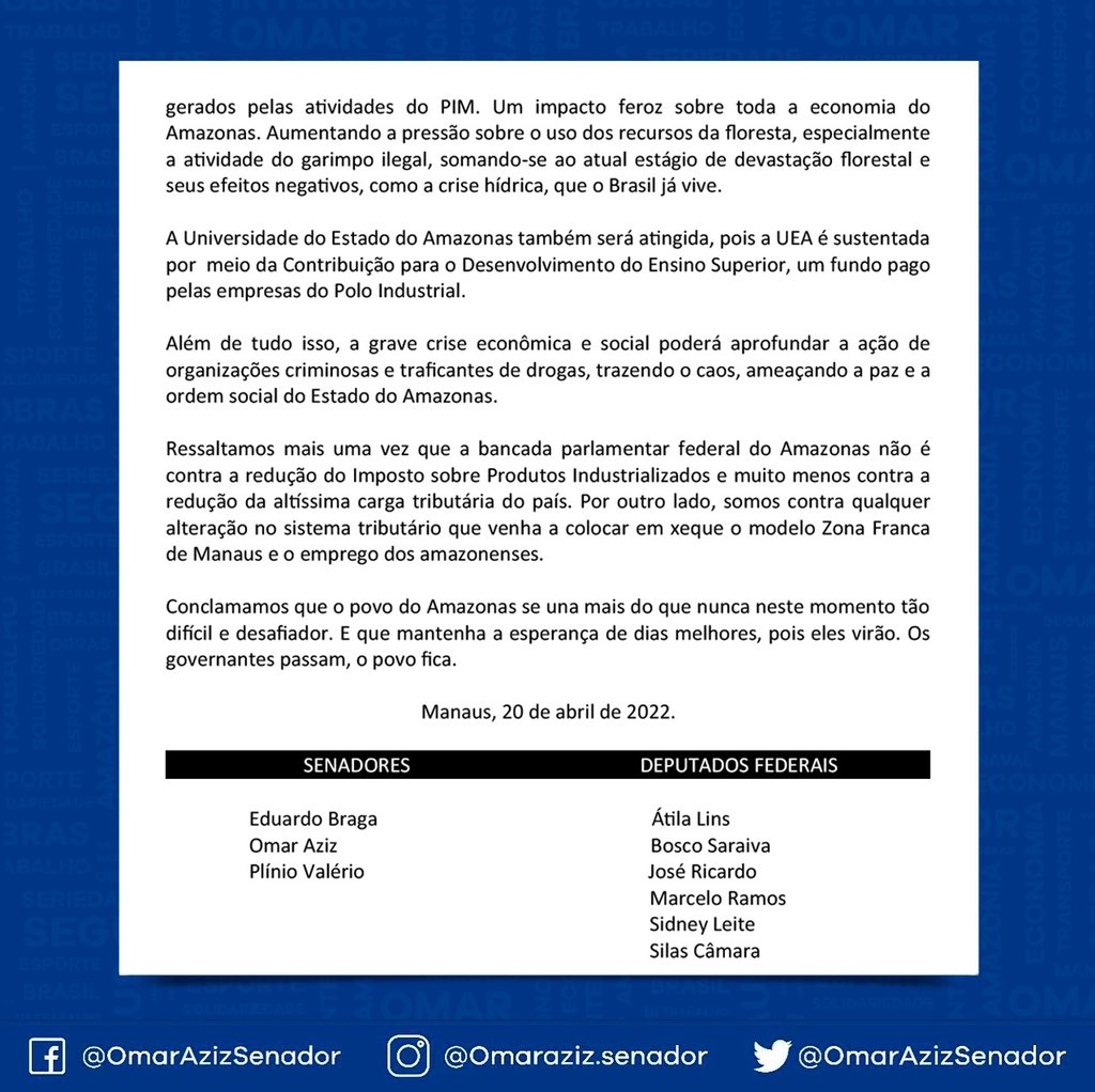 Também não podemos esquecer dos deputados federais Delegado Pablo (União) e Capitão Alberto Neto (PL) que após votarem 100% com as pautas do presidente na Câmara, se uniram ao governador no silêncio diante da ameaça ao Pólo Industrial. Nesta quarta-feira (21/04/2022), toda a bancada amazonense no Congresso assinou um manifesto (abaixo) em defesa do modelo econômico, com exceção dos dois. Até o prefeito David Almeida (Avante), um notório bolsonarista de carteirinha, já entendeu que a única alternativa é a judicialização.