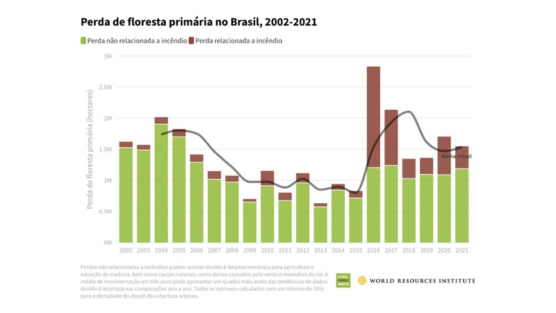 A atualização deste ano apresenta uma novidade, que são as perdas de florestas causadas ou não por fogo. No caso do Brasil, nem mesmo a redução dos focos na Amazônia e Pantanal em 2021 alterou essa tendência. As perdas não relacionadas ao fogo — que no Brasil são mais frequentemente associadas à expansão agrícola — aumentaram 9% entre 2020 e 2021.