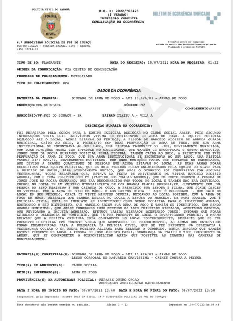 O guarda municipal, diretor do Sindicato de Servidores Públicos do município e tesoureiro do PT Marcelo Arruda foi assassinado na madrugada deste domingo (10/07/2022) em Foz do Iguaçu, no Paraná. Ele foi morto em sua festa de aniversário de 50 anos após levar três tiros disparados pelo membro da Polícia Penal Federal (PPH) bolsonarista Jorge José da Rocha Guaranho. O motivo teria sido o tema da festa: o ex-presidente Luís Inácio Lula da Silva.