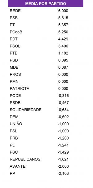 Na avaliação das médias de desempenho por estado, o melhor resultado ficou para o conjunto de parlamentares de Rondônia, com média 2. O estado de Roraima obteve a menor média, com -0,33.