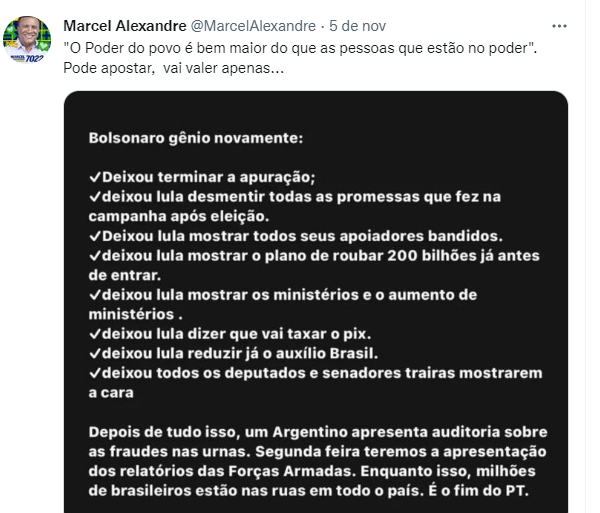 O vereador e pastor evangélico Marcel Alexandre, por sua vez, replicou em seu perfil no Twitter, informações falsas sobre uma transmissão de um canal argentino de extrema direita no YouTube que divulga informações falsas sobre as eleições brasileiras. O vídeo já foi desmentido pelo Tribunal Superior Eleitoral (TSE).