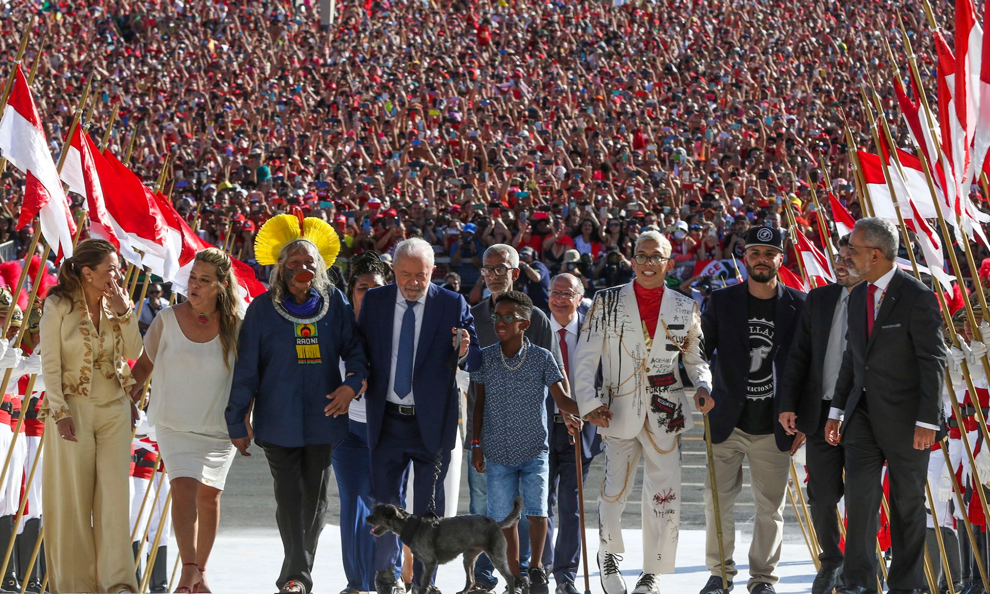 No alto da rampa, a faixa presidencial passou de mão em mão até ser entregue a Lula por uma mulher negra catadora de materiais recicláveis. No grupo, havia ainda uma criança negra, uma pessoa com deficiência, o cacique Raoni, líder indígena reconhecido internacionalmente, e pessoas que participaram da vigília permanente durante os 580 dias que Lula permaneceu preso em Curitiba, entre 2018 e 2019.