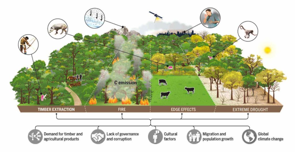 Foram considerados quatro fatores principais de degradação: fogo na floresta, efeito de borda (as mudanças que acontecem em áreas de floresta ao lado das áreas desmatadas), extração seletiva (como desmatamento ilegal) e secas extremas. Diferentes áreas de florestas podem ser atingidas por um ou mais desses fatores, que têm diferentes origens. “Apesar da incerteza sobre o efeito total desses distúrbios, está claro que o efeito total pode ser tão importante como o efeito de desmatamento para emissões de carbono e a perda de biodiversidade”, diz Jos Barlow, pesquisador da Universidade de Lancaster, na Inglaterra, e coautor do estudo.