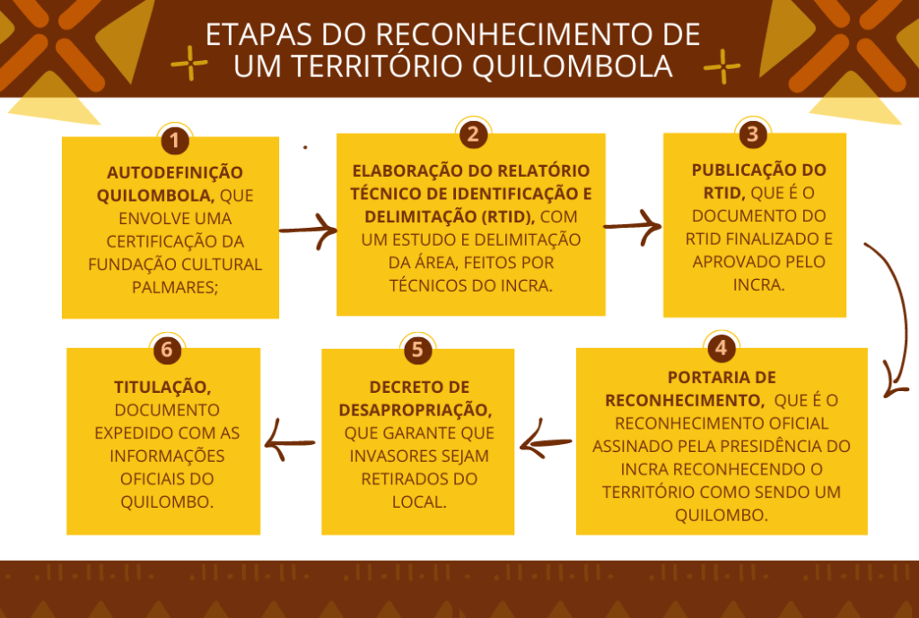 1) Autodefinição quilombola, que envolve uma certificação da Fundação Cultural Palmares; 2) Elaboração do Relatório Técnico de Identificação e Delimitação (RTID), com um estudo e delimitação da área, feitos por técnicos do Incra; 3) Publicação do RTID, que é o documento do RTID finalizado e aprovado pelo Incra; 4) Portaria de reconhecimento, que é o reconhecimento oficial assinado pela presidência do Incra reconhecendo o território como sendo um quilombo; 5) Decreto de desapropriação, que garante que invasores sejam retirados do local; e 6) Titulação, documento expedido com as informações oficiais do quilombo.