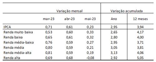 Em termos absolutos, as famílias de renda alta tiveram o maior alívio inflacionário, com deflação de 0,08%, enquanto o segmento de renda muito baixa apresentou a taxa mais elevada de inflação no período (0,33%). No acumulado de janeiro a maio deste ano, famílias de renda muito baixa registraram a menor taxa de inflação (2,65%), ao passo que, a classe de renda média-alta apresentou a maior taxa (3,13%), de acordo com a tabela abaixo: