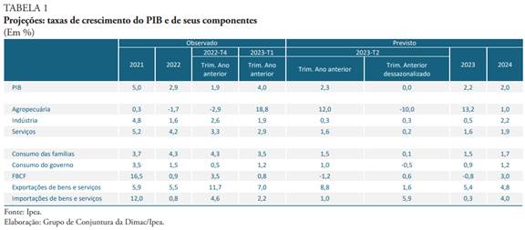 Refletindo o desempenho excepcional do PIB agropecuário, assim como a resiliência dos indicadores de mercado de trabalho, o resultado veio acima da previsão divulgada na Visão Geral da Conjuntura, de março, que supunha altas de 1,2% na margem e de 2,7% na comparação interanual. Diante do cenário, o Ipea reviu para cima a previsão de crescimento do PIB de 1,4% para 2,2% em 2023 e manteve a previsão de 2% para o resultado de 2024, conforme tabela abaixo: