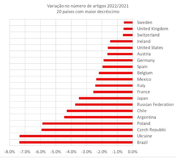 O documento mostra que o Brasil teve um decréscimo de 7,4% na sua produção científica em 2022 em comparação ao ano anterior. A queda na quantidade de ciência brasileira em 2022 se assemelha à da Ucrânia, país que entrou em guerra naquele ano. Brasil e Ucrânia tiveram a maior perda de produção científica entre os países analisados.