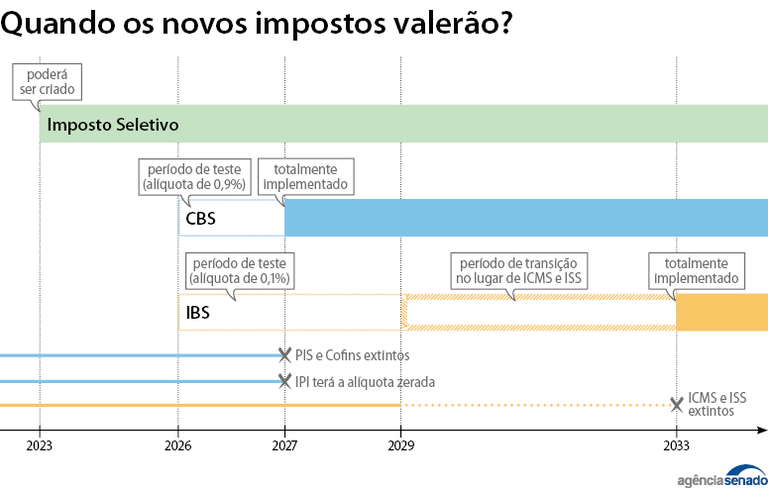 A CBS, que também terá regras dispostas em lei complementar, vigorará integralmente em 2027 e terá suas alíquotas fixadas pelo Senado. Mas em 2026 a União poderá aplicar alíquota de 0,9% como teste. Assim como o IBS, o contribuinte terá valores reduzidos do PIS e da Cofins, além de outras formas previstas em futura lei.