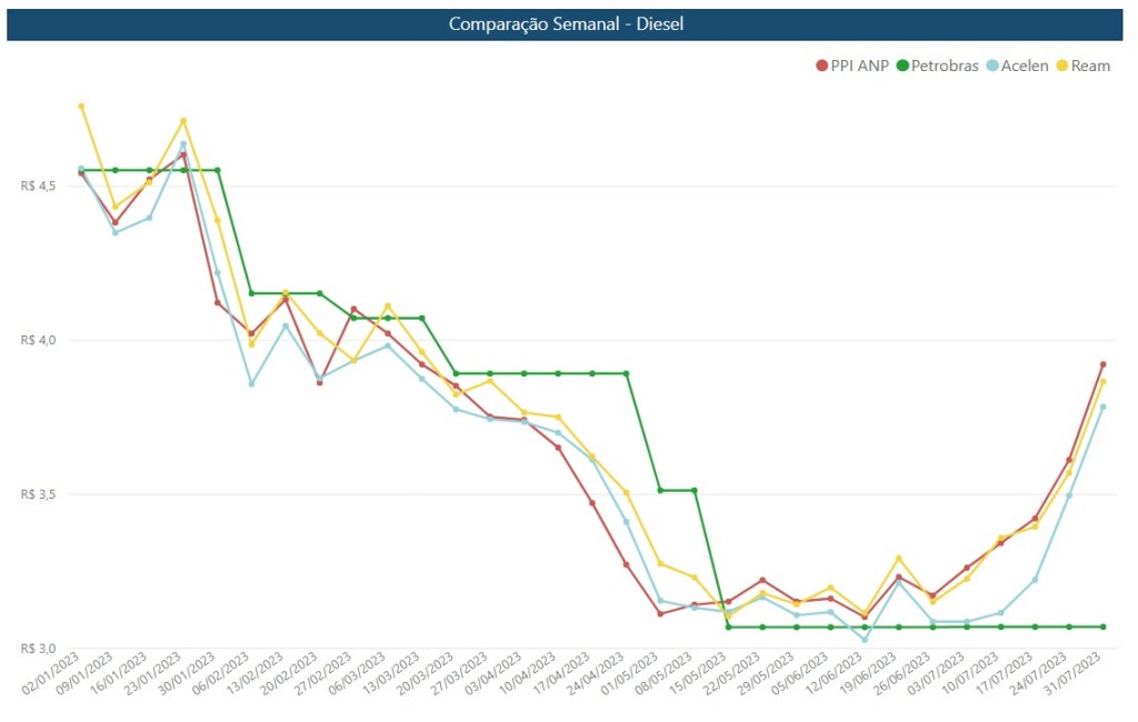 A estratégia comercial atua no sentido de não transferir a volatilidade dos preços internacionais para o mercado interno. A Petrobrás tem cumprido integralmente as entregas para as distribuidoras. Abaixo, comparativo elaborado pelo Instituto de Estudos Estratégicos de Petróleo, Gás Natural e Biocombustível (Ineep), com base nos dados da ANP, do preço do PPI calculado pela ANP com os preços praticados pela Petrobrás, Acelen (BA) e Ream (AM) no caso do diesel.