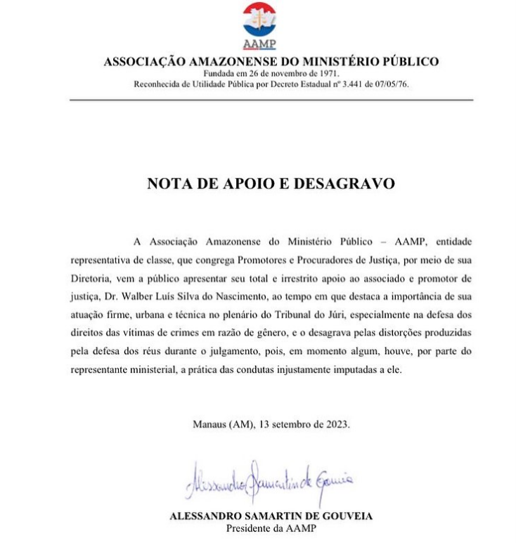 Já o presidente da Associação Amazonense do Ministério Público (AAMP), Alessandro Gouveia, publicou nota mostrando “total e irrestrito apoio” ao promotor Walber do Nascimento. O promotor inclusive postou a carta em suas redes sociais.
