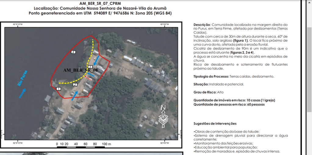 Relatório da Companhia de Pesquisa de Recursos Minerais (CPRM), o Serviço Geológico do Brasil, já alertava desde 2014 para o risco de acidentes naturais no município de Beruri, distante 173 quilômetros de Manaus. Um barranco desabou na Vila Arumã no município neste domingo (01/10/2023), matando uma criança, deixando outras quatro desaparecidas e destruindo mais de 40 casas.