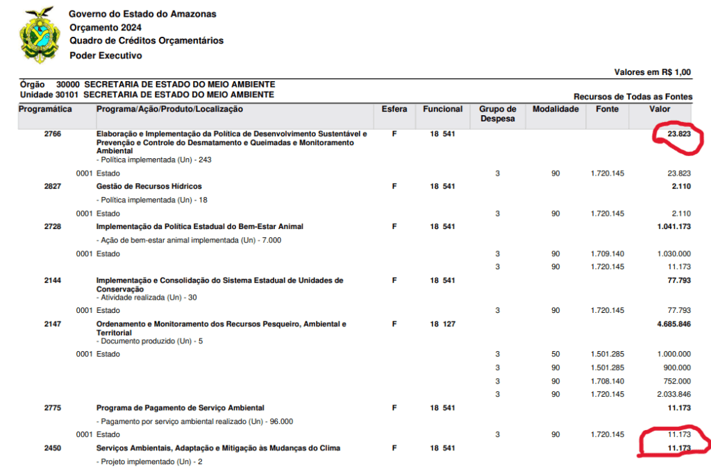 Enquanto isso, segundo dados da Lei Orçamentária Anual (LOA) do Amazonas para 2024, o valor da verba do governo do Amazonas para o programa de Elaboração e Implementação da Política de Desenvolvimento Sustentável e Prevenção e Controle do Desmatamento e Queimadas e Monitoramento Ambiental é de apenas R$ 23.823,00.