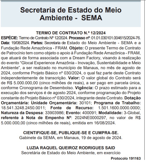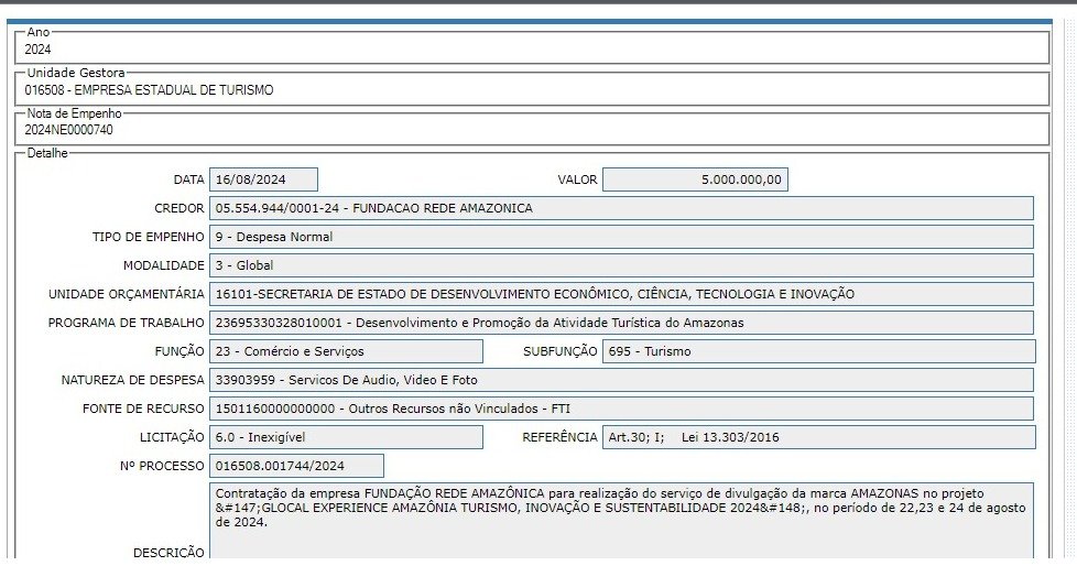 Enquanto destinou apenas R$ 23 mil para o combate às queimadas no Amazonas, o governo do estado, por meio da Secretaria de Estado do Meio Ambiente (SEMA) destinou nada menos do que R$ 5 milhões em contrato de patrocínio para o evento “Glocal Experience Amazônia – Inovação, Sustentabilidade e Meio Ambiente”, da Fundação Rede Amazônica (FRAM). No total, foram investidos em dinheiro público cerca de R$ 18 milhões.