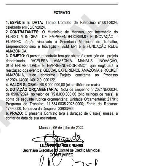 Isso porque também entram nessa conta mais, além do valor dado pela SEMA, mais R$ 5 milhões da Empresa Estadual de Turismo do Amazonas (Amazonastur). Já os valores destinados pela prefeitura de Manaus, por meio do Fundo Municipal de Empreendedorismo e Inovação (FUMIPEQ), da Secretaria Municipal do Trabalho, Empreendedorismo e Inovação (SEMTEPI) foram ainda maiores: nada menos do que R$ 8 milhões por um contrato de seis meses. Com um dado curioso: esse contrato seria apenas para um único projeto, o Acelera Amazônia Manaus Inovação Sustentabilidade e Empreendedorismo.