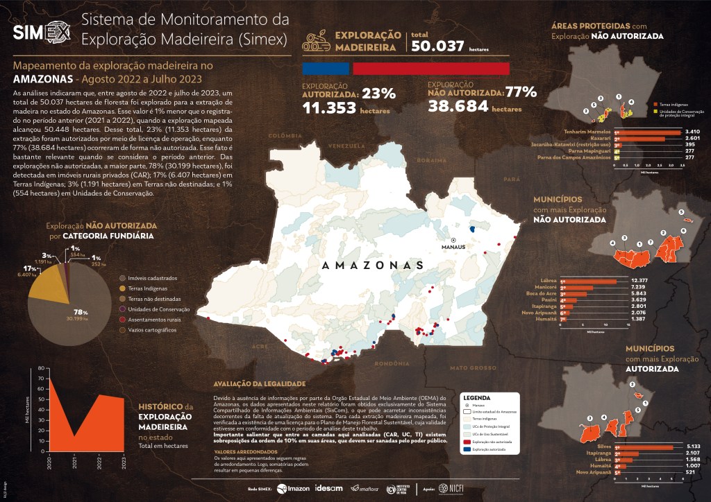 O Simex utilizou dados do Sistema Compartilhado de Informações Ambientais (SisCOM) para produzir a análise e chegou ao diagnóstico de que, apesar do montante da exploração florestal total (legalizada ou não) identificada no Amazonas ter sido 1% menor que o registrado no período anterior (2021 – 2022, quando a exploração mapeada alcançou 50.448 ha), o avanço da exploração ilegal é preocupante.