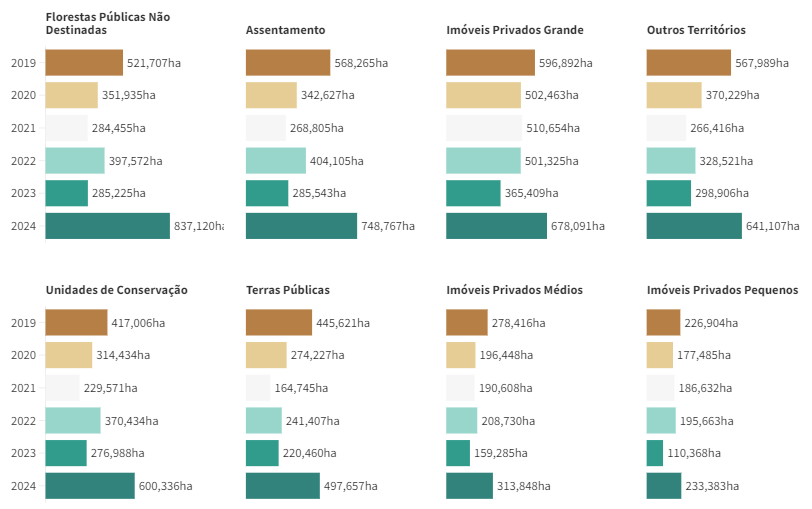 O avanço generalizado do fogo em imóveis rurais também pode ser observado em áreas de diferentes tamanhos. As grandes propriedades concentram a maior parte do fogo em relação às demais áreas privadas, com a área queimada passando de 1 milhão de hectares em 2023 para 2,8 milhões de hectares em 2024. Em propriedades pequenas, o aumento foi de 99% no período analisado, enquanto as médias registraram uma área queimada 107% maior. Os assentamentos rurais também tiveram um crescimento expressivo, superando 800 mil hectares de área queimada em 2024, um aumento de 132% em relação ao ano anterior.
