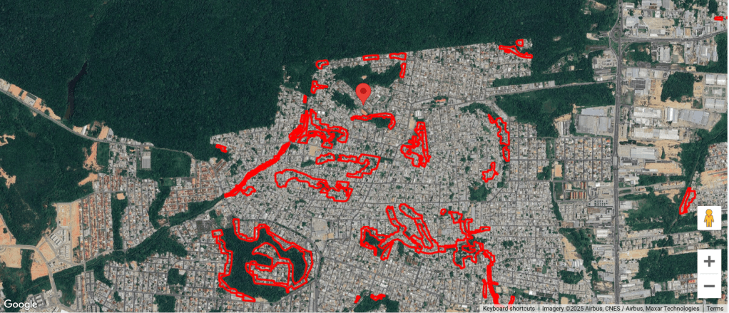 Imagens do Sistema de Proteção e Defesa Civil (SISPDEC), da Defesa Civil do Amazonas, mostram o bairro Redenção, com diversas áreas de risco destacadas em vermelho. Essas marcações geralmente indicam áreas de risco geológico ou ambiental, como regiões sujeitas a alagamentos, deslizamentos de terra, erosão ou outros fenômenos que podem comprometer a segurança da população.