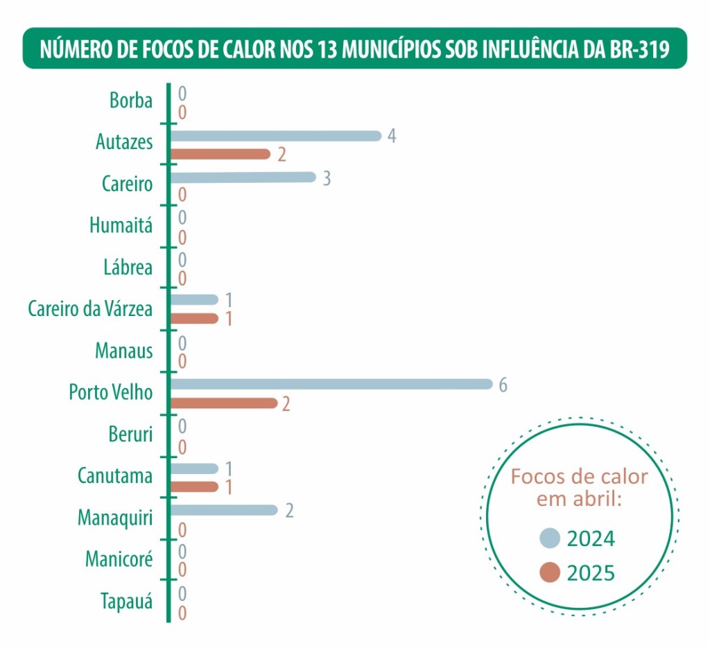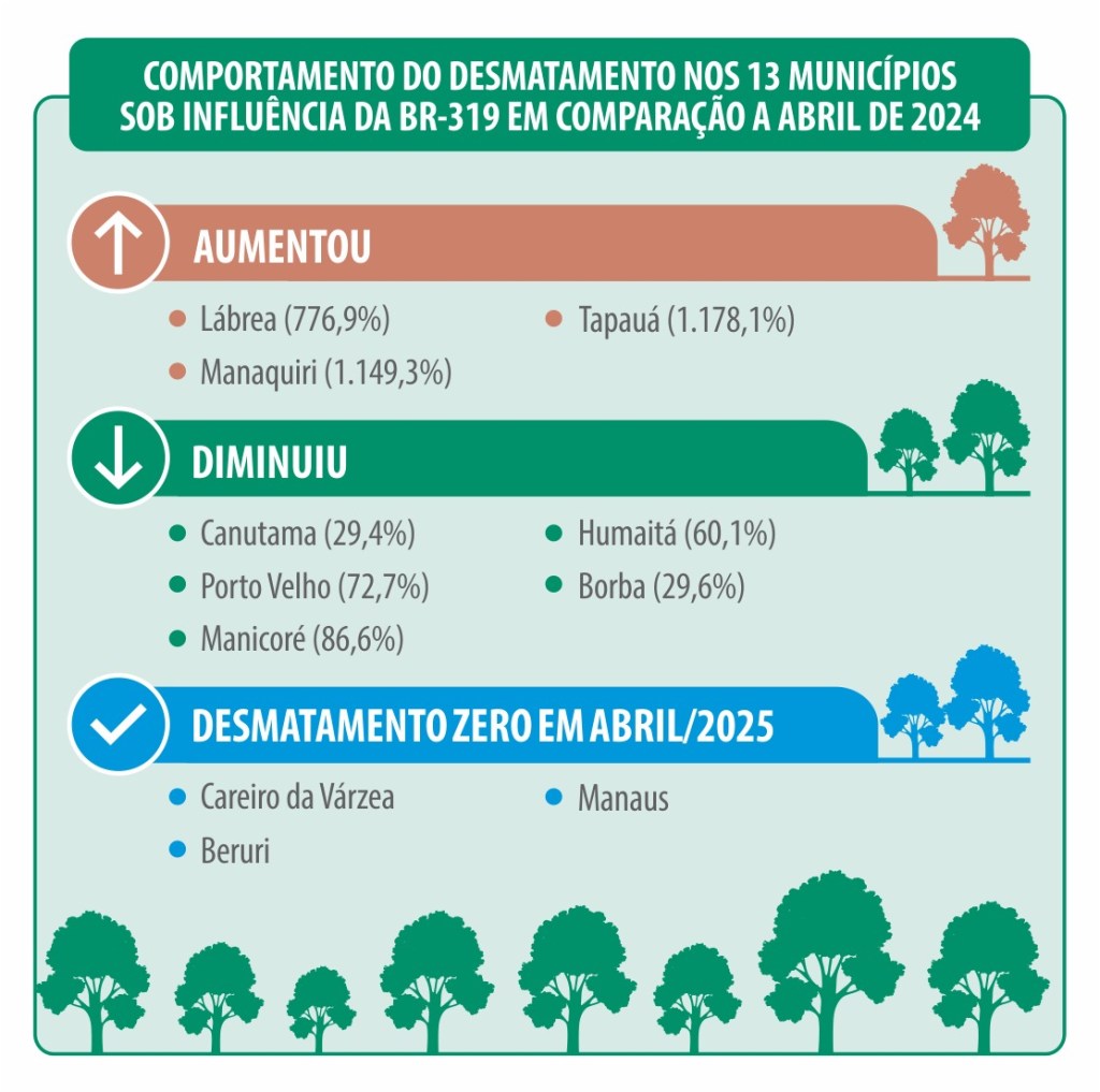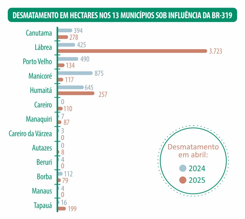 Entre os 13 municípios localizados na área de influência direta da BR-319, Tapauá, Manaquiri e Lábrea lideraram os aumentos percentuais de alertas, com crescimentos de 1.178,1%, 1.149,3% e 776,9%, respectivamente. O caso de Lábrea é ainda mais preocupante, pois concentrou 34% de todos os alertas registrados no Amazonas em abril, com 3.722 hectares desmatados. Canutama, mesmo com queda de 29% em relação ao ano anterior, ocupou o segundo lugar no ranking regional, com 278 hectares.