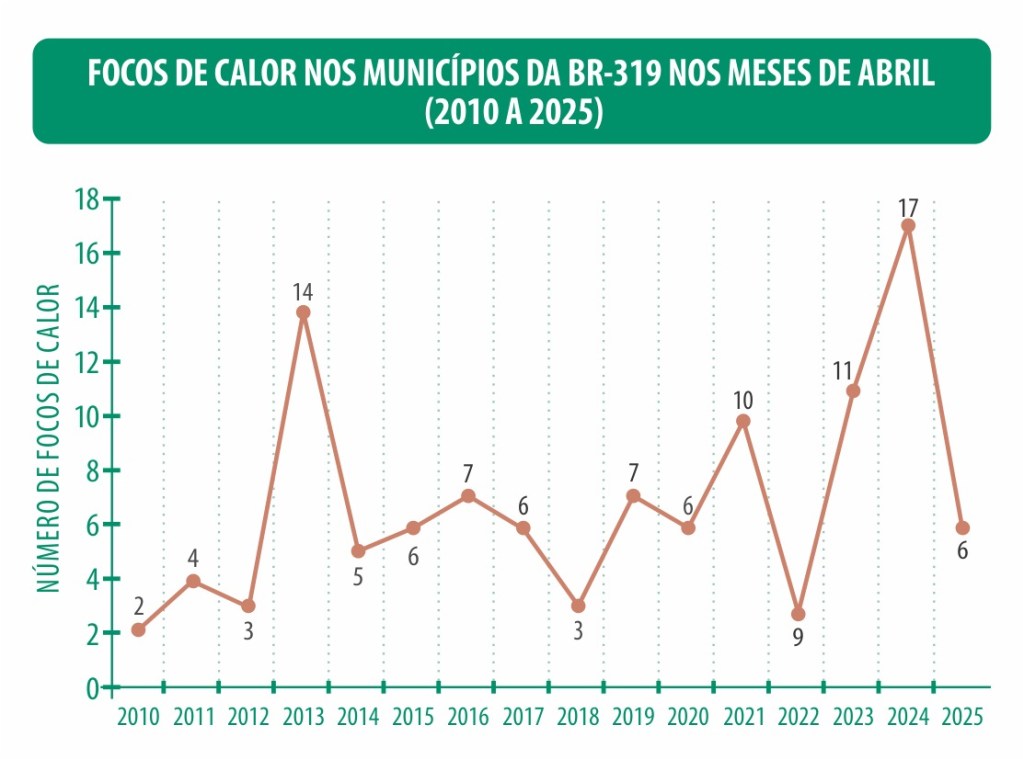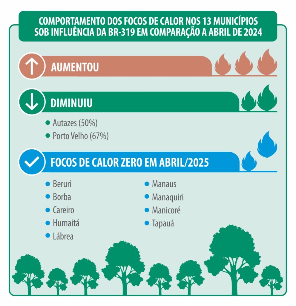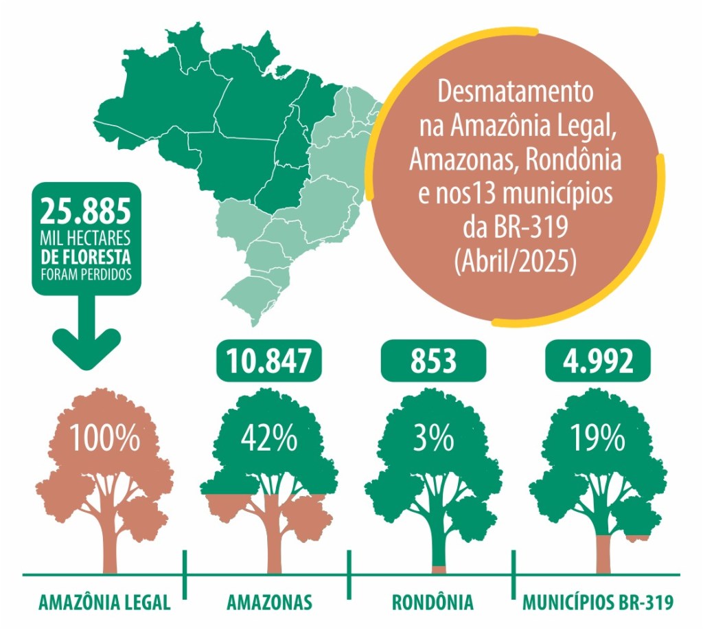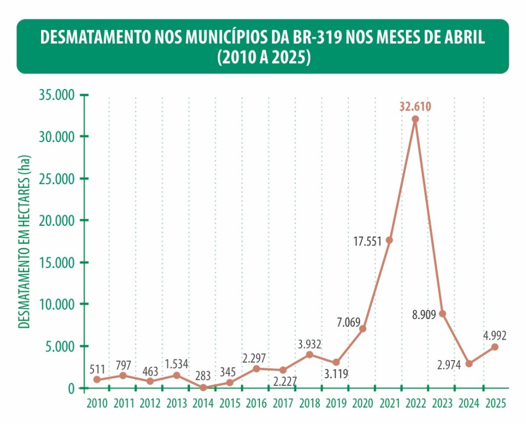 Especialistas apontam que esse avanço do desmatamento, inclusive dentro de Unidades de Conservação (UCs), está relacionado à retomada das discussões sobre a reconstrução da BR-319. Áreas como a Floresta Estadual de Tapauá (77,5 ha), o Parque Nacional Mapinguari (95,8 ha) e a Floresta Nacional do Iquiri (60,25 ha) voltaram a registrar desmatamento. No entanto, nenhuma das 69 Terras Indígenas monitoradas apresentou perda de vegetação, o que reforça o papel estratégico desses territórios para a proteção da floresta.