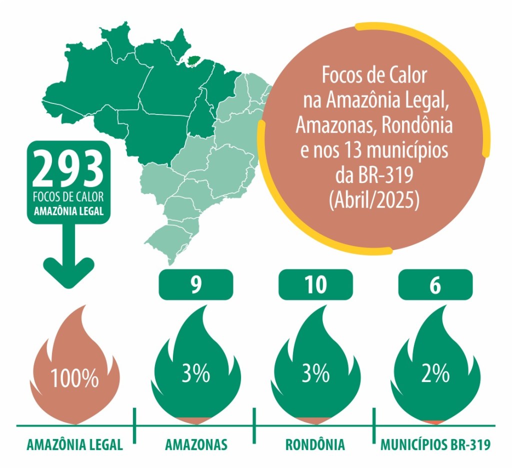 Apesar da alta do desmatamento, os focos de calor caíram significativamente no mesmo mês, graças ao regime de chuvas: 73% de queda na Amazônia Legal, com 64% no Interflúvio Madeira-Purus. Apenas seis focos foram detectados nos 13 municípios monitorados. Nenhuma das Terras Indígenas apresentou focos de calor, e entre as 42 UCs monitoradas, apenas a APA do Rio Madeira teve um registro.
