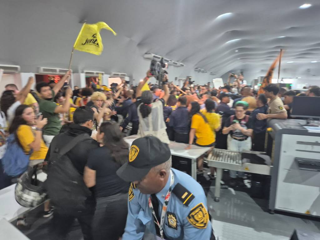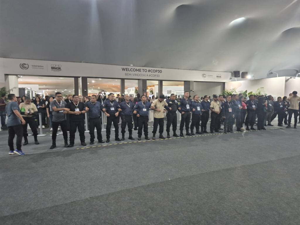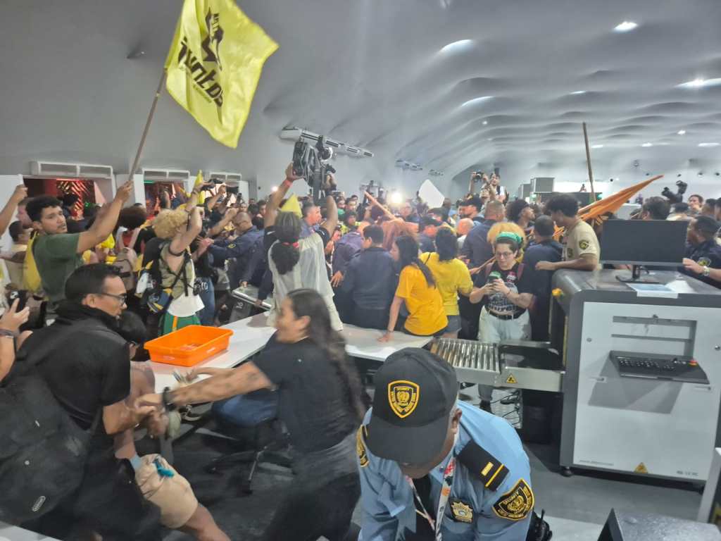 Manifestantes invadiram o Hangar da COP30, em Belém, e entraram em confronto com seguranças após romper barreiras de acesso. Houve empurra-empurra próximo aos raio-x, ação violenta de seguranças estrangeiros e intimidação a jornalistas. A PM estava nos arredores, mas não interveio
