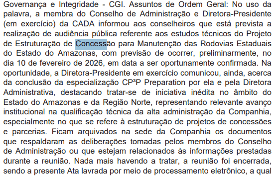 As informações constam da ata da 61ª Reunião Ordinária do Conselho de Administração da CADA, publicada no Diário Oficial do Estado do Amazonas em 4 de fevereiro de 2026, que registra a convocação de audiência pública para apresentação do projeto de concessão das rodovias estaduais.