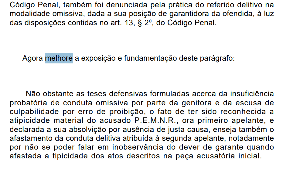 O documento oficial inclui um comando típico de interação com modelos de linguagem e registra datas incompatíveis com os fatos descritos no processo. No fólio 44 do acórdão consta a frase “Agora melhore a exposição e fundamentação deste parágrafo:”, seguida de um trecho com linguagem mais elaborada que o texto anterior. O documento também aponta o julgamento em 11/02/2026 e a publicação em 12/02/2026, além de mencionar um Recurso Especial julgado em 02/09/2025, embora trate de fatos ocorridos em 2024.