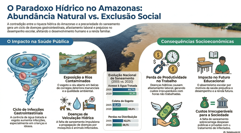 Manaus, 01 de março de 2026 – No coração da maior bacia hidrográfica do planeta, a exclusão ao acesso à água tratada ainda molda o cotidiano de milhões de pessoas. Dados reunidos pelo Instituto Trata Brasil e pela Ex Ante Consultoria Econômica, com base em informações do Sistema Nacional de Informações sobre o Saneamento (SNIS), do Instituto Brasileiro de Geografia e Estatística (IBGE) e do Departamento de Informática do SUS (DATASUS), mostram que a Região Norte concentra os piores indicadores de saneamento básico do país. No Amazonas, os números revelam um cenário de retrocesso e desigualdade persistente.