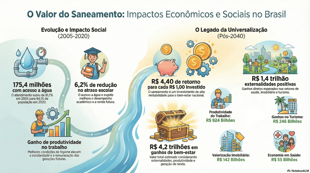 A projeção econômica indica que, entre 2021 e 2040, a universalização pode gerar R$ 1,455 trilhão em benefícios econômicos e sociais, frente a custos estimados de R$ 639 bilhões. O saldo positivo projetado é de R$ 816 bilhões, com retorno superior a R$ 4 para cada R$ 1 investido, além de legado pós-2040 estimado em R$ 1,4 trilhão em benefícios líquidos para a sociedade brasileira.