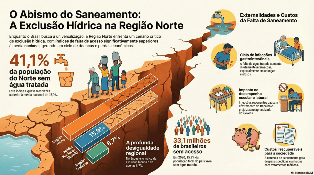 Entre 2005 e 2020, a Região Norte recebeu apenas 4,7% dos investimentos nacionais em expansão do saneamento. Ainda assim, a projeção para 2021-2040 indica que a universalização pode gerar superávit anual de R$ 5,78 bilhões na região, sendo R$ 1,14 bilhão por ano apenas no Amazonas.