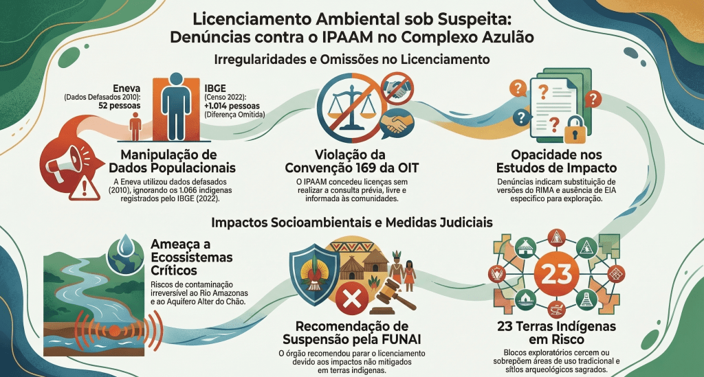 Um dos casos mais recentes envolve o próprio Complexo Azulão, onde a Justiça Federal determinou a suspensão de atividades de exploração de gás natural conduzidas pela Eneva após reconhecer omissões graves no licenciamento ambiental realizado pelo IPAAM. A decisão judicial apontou ausência de consulta prévia a comunidades indígenas e tradicionais, além da falta de estudos específicos sobre a presença de povos isolados na região afetada pelo empreendimento.