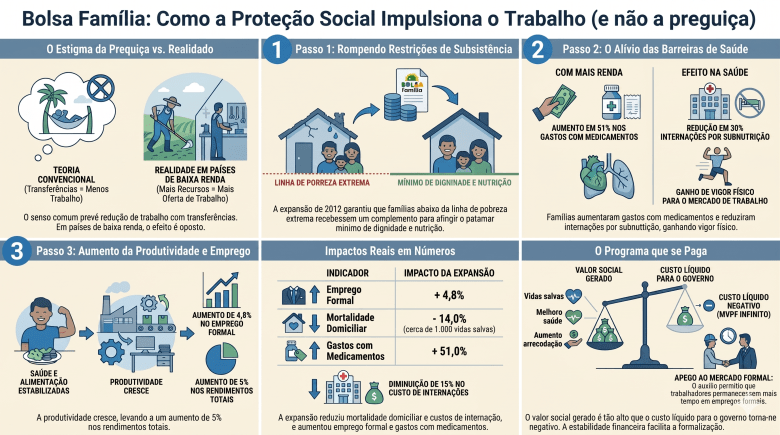 A ideia de que o Bolsa Família estimularia a “preguiça” não encontra respaldo nos dados analisados porque parte de uma premissa que desconsidera as condições reais da extrema pobreza. Em contextos de privação severa, a limitação ao trabalho não está na falta de vontade, mas na ausência de condições mínimas para que o indivíduo seja produtivo, como alimentação adequada, acesso a tratamento de saúde e estabilidade básica. Ao garantir esse piso, o programa reduz barreiras que impedem a entrada e permanência no mercado de trabalho, o que ajuda a explicar por que, mesmo sob regras que poderiam desestimular o emprego formal, houve aumento da ocupação e da renda entre os beneficiários.