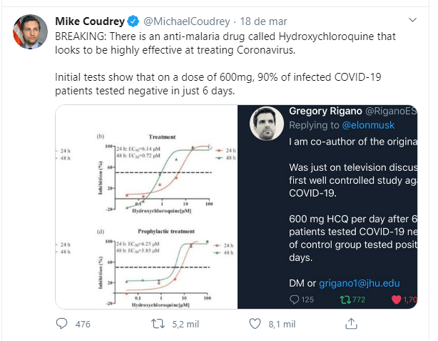 O presidente Donald Trump iniciou a campanha para o uso indiscriminado da cloroquina utilizando um tuíte (abaixo) do dia 18 de março, justamente de Michael Coudrey, autor do boato que culminou nos ataques aos cientistas brasileiros. Coudrey, que se define como empreendedor e ativista, usou um gráfico de um estudo produzido na França que testou apenas 36 pacientes, e não foi revisado por outros cientistas. Enquanto o trabalho da FMT testou mais que o dobro de pessoas (81) e teve revisão por outros cientistas e foi publicado em plataformas oficiais.