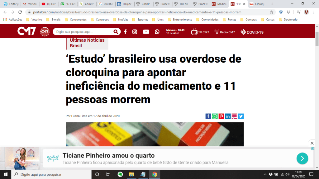Um grupo de pesquisadores da Fundação de Medicina Tropical do Amazonas passou a sofrer ameaças de morte e ataques virtuais durante esta semana. Eles trabalham no estudo CloroCovid-19, que estuda os efeitos da cloroquina em pacientes com a Covid-19, doença causada pelo novo coronavírus. O grupo passou a ser alvo de ataques após uma série de publicações acusarem os cientistas de matar pacientes do estudo usando altas doses de cloroquina. Motivo seria desqualificar o uso do medicamento por supostas razões políticas.